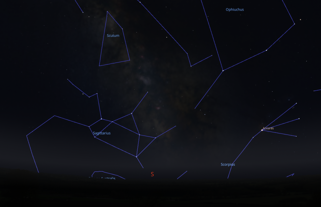 Looking south at 1.30 AM on June 25th. Image credit: Stellarium.