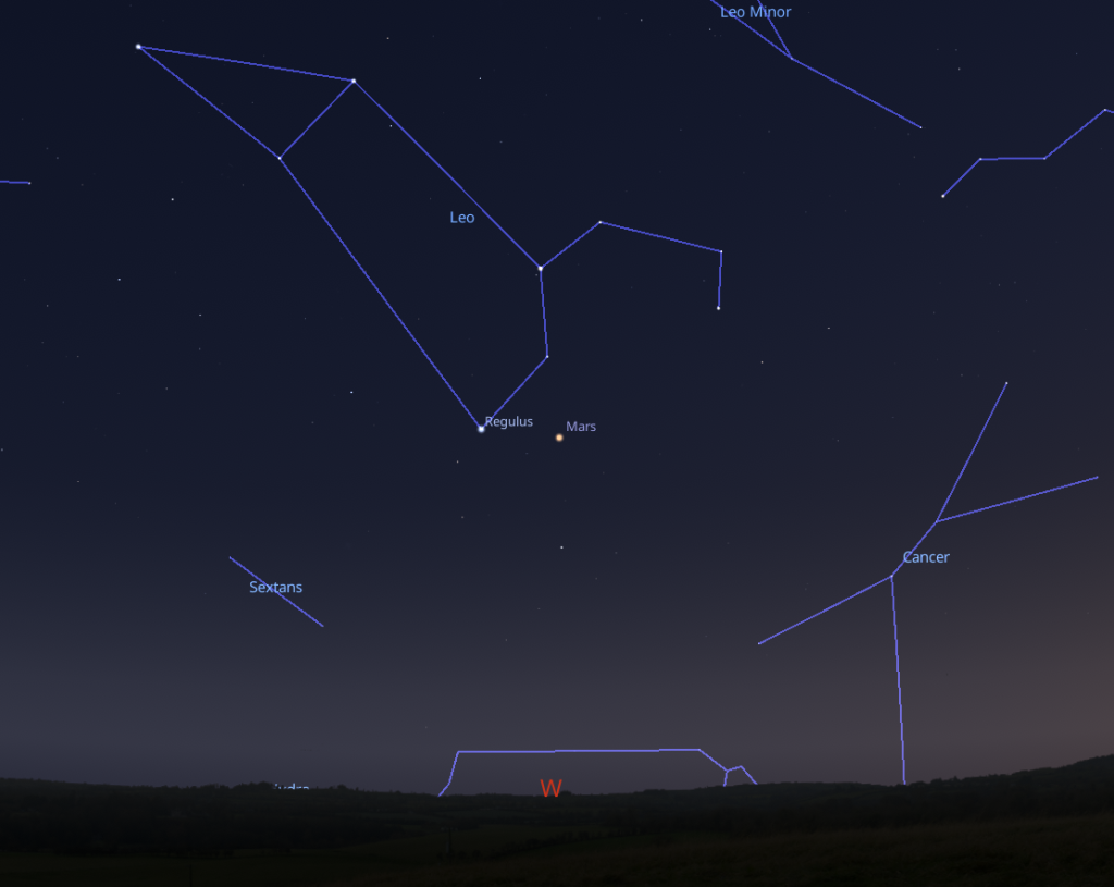 Looking west towards Mars at 11.30 PM on June 10th. Image Credit: Stellarium.